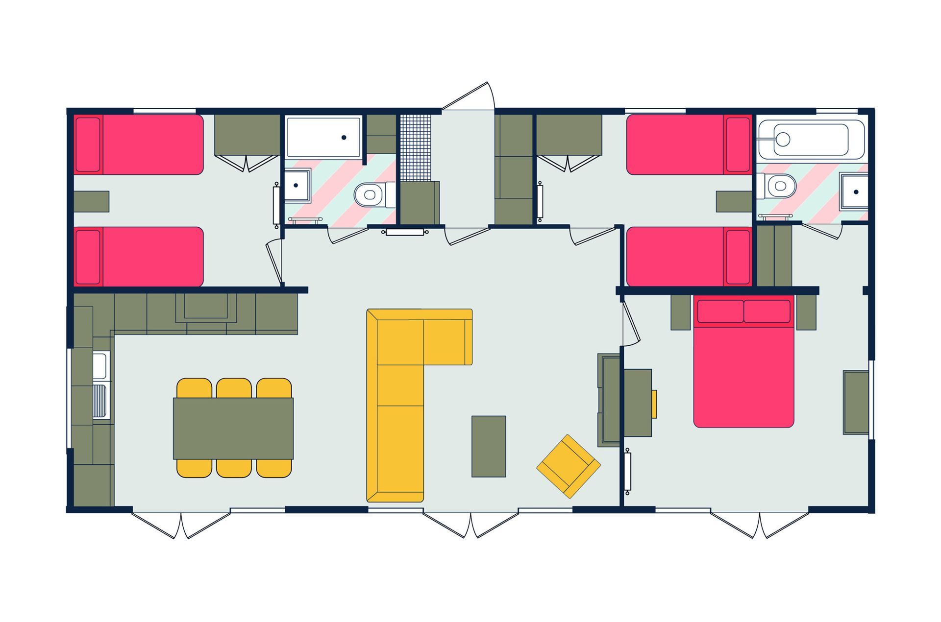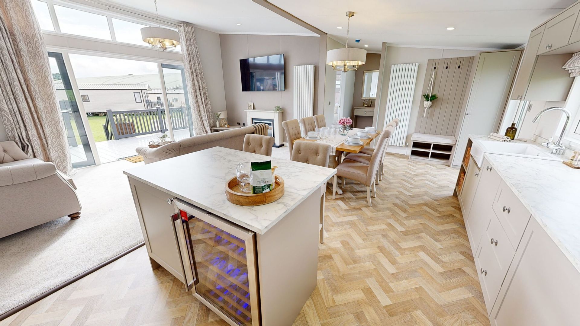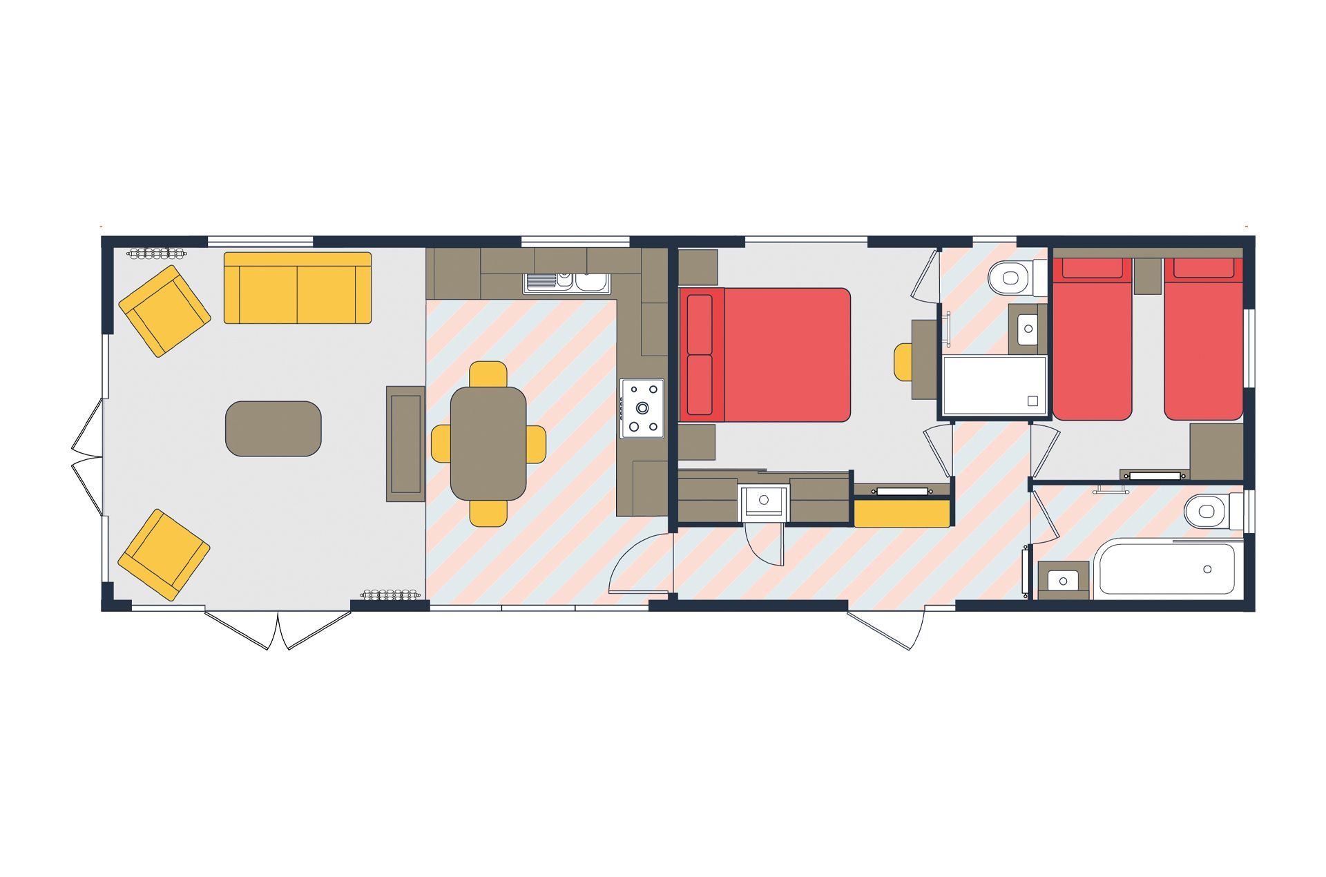 Arran is available in a 40 x 20ft layout with 3 bedrooms. The lodge includes a large kitchen/diner and family living space: family bath, shower and master bedroom with ensuite and twin bedroom.