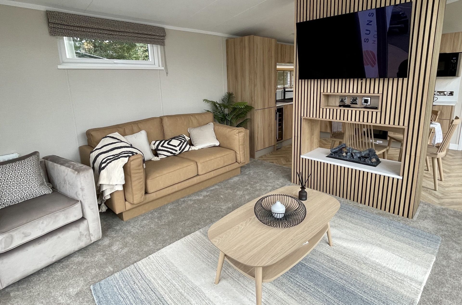 - Luxury open-plan living room with sumptuous carpets, furniture, and feature entertainment wall unit to house up to a 65”